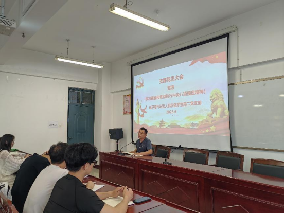 首先,深入学习习近平总书记重要文章《锲而不舍落实中央八项规定精神,以优良党风引领社风民风》,牛振振强调全体党员同志落实中央八项规定精神的重要性,要求各位同志严守纪律红线,抵制歪风邪气,以优良作风引领学风清正。随后,在接收预备党员议程,3名发展党员经陈述入党志愿、介绍个人思想情况、投票等环节,成为预备党员并表态,全体党员随后面向党旗宣誓。最后,张涵同志以《从八项规定入手抓党的作风建设》为题讲授党课,深入解读其内涵实质,回顾党中央落实成效,强调高校应推动中央八项规定精神在校园落地。