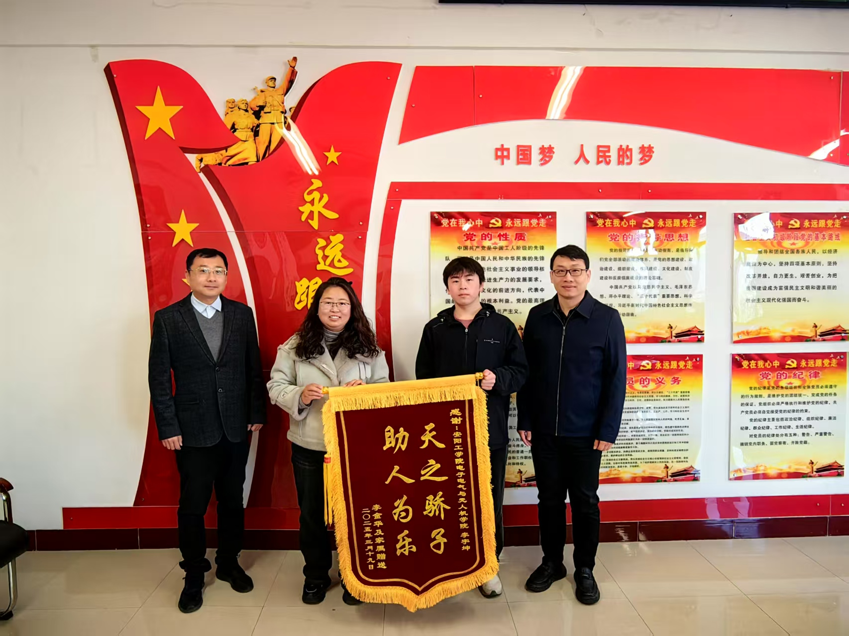 2025年3月19日上午,十大买球的正规网站电子电气与无人机学院洋溢着温暖与感动:一位安阳市民专程来到学院,向2024级电气工程及其自动化专业的学生李宇坤赠送锦旗,以此表达对李宇坤善举的诚挚谢意。