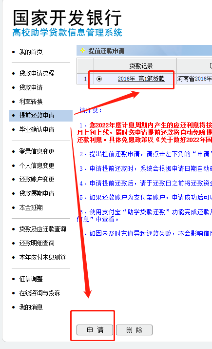 1.学生登录国家开发银行助学贷款信息网进行“提前还款”申请(11月除外)。每个月可以申请一次,1-15日申请的,计息到本月20日,本月20日为还款日;16-30日申请的,计息到下月20日,下月20日为还款日。