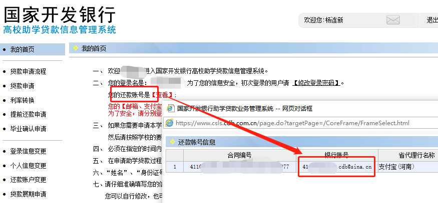 2.输入还款的支付宝账户,注意该账户为助学贷款系统中的账户,在学生在线服务系统中查看: