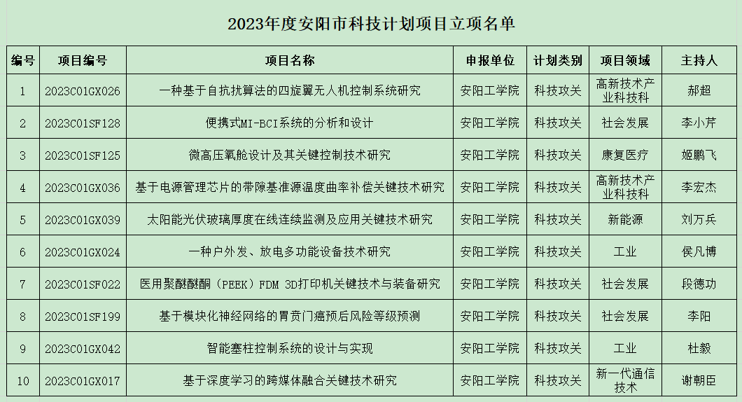 8月8日,根据安阳市科学技术局下发《关于下达2023年度安阳市科技发展计划的通知》(安科〔2023〕33号),十大买球10个项目获批2023年度安阳市发展计划项目立项。