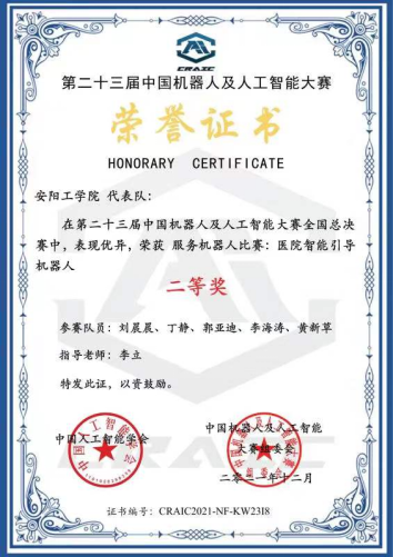 近日,由中国人工智能学会主办的第二十三届中国机器人及人工智能大赛全国总决赛结果公布,电子信息与电气工程学院李立老师指导的2019级学生刘晨晨等获得全国二等奖。