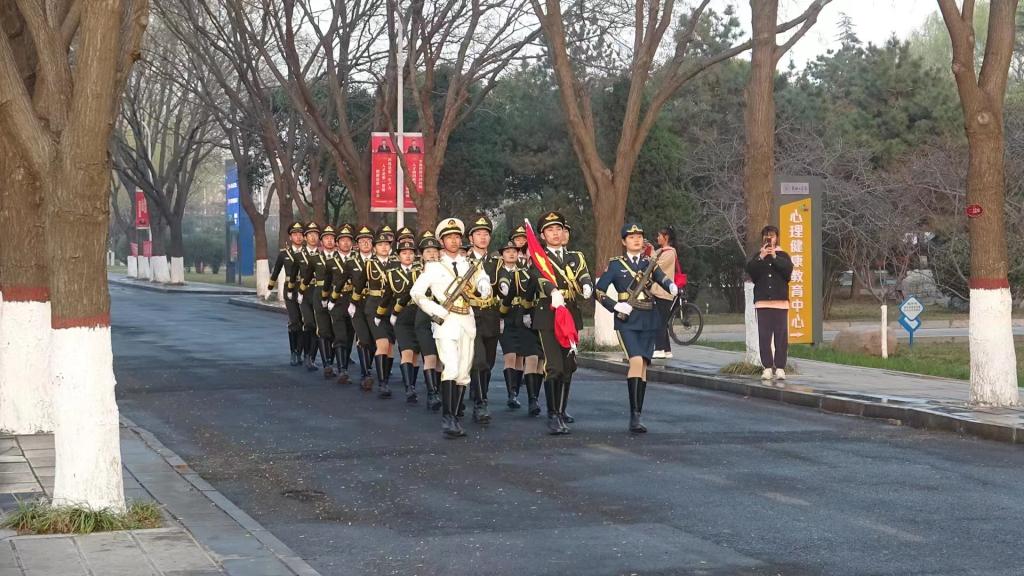 一阵清脆响亮的脚步声传来,国旗护卫队迈着整齐的步伐向升旗台缓缓前进,随着义勇军进行曲的响起,鲜艳的五星红旗在同学们的注视下缓缓升起,全体学生向国旗行注目礼。