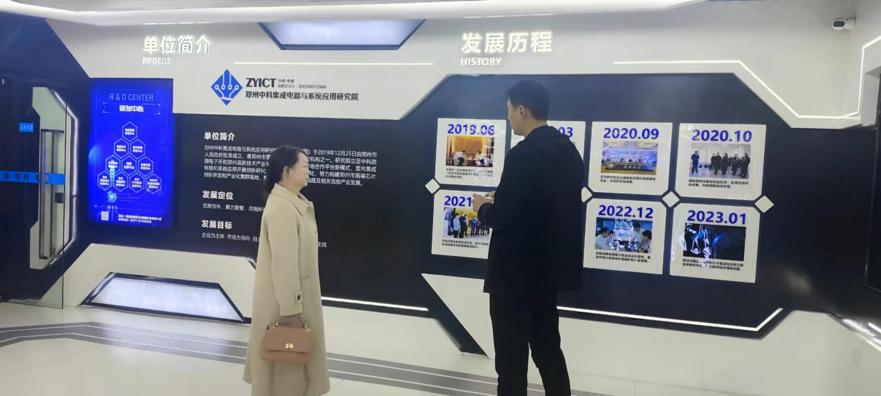 段德功一行实地参观了郑州中科集成电路与系统应用研究院实训基地,并深入了解了21级电子信息工程专业学生毕业实习开展情况,随后市场总监靳彦磊陪同段德功一行参观了企业文化展厅。