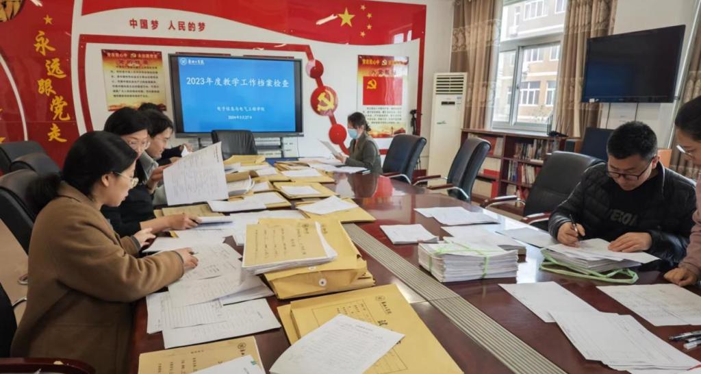 为提升本科教育教学质量,扎实做好教学日常管理和质量监控工作,进一步完善教学档案材料管理,十大买球的正规网站成立教学工作档案检查工作小组,副院长段德功任组长,成员包括教研室主任和骨干教师代表。3月27日上午,工作小组在A-07 308对学院2023年度教学工作档案进行检查。